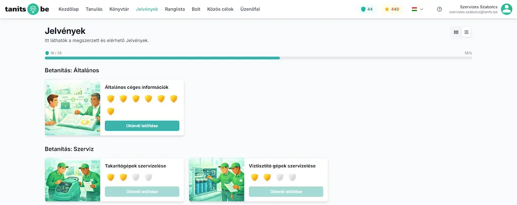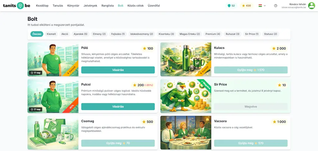 A tanits.be Engage modulja a tanulást és a közösségi aktivitást motivációs elemekkel támogatja. Jelvények, pontok, ranglisták, bolt és közös célok építhetők a képzési folyamat köré. A beállítások admin felületen kezelhetők, így a gamifikáció nem dísz, hanem irányítható ösztönzési rendszer.