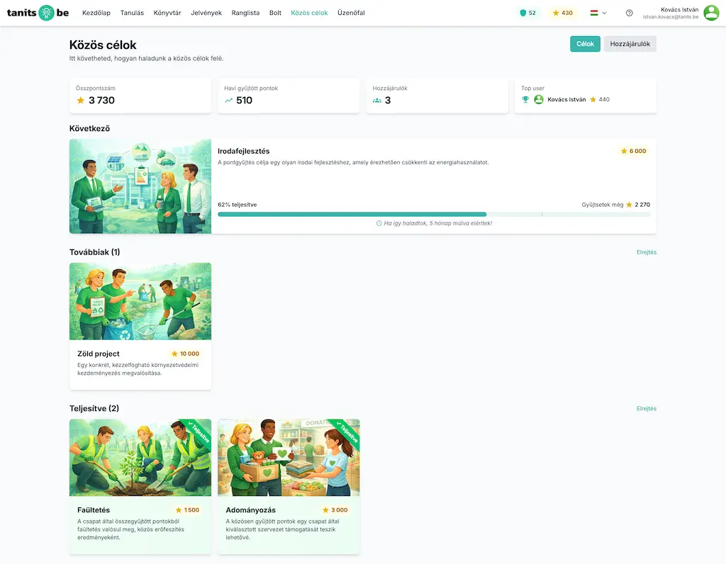 Az egyénileg megszerzett pontok összevonhatók nagyobb, közösségi célok teljesítéséhez. A felület folyamatosan mutatja a cél állapotát és az egyéni hozzájárulásokat.